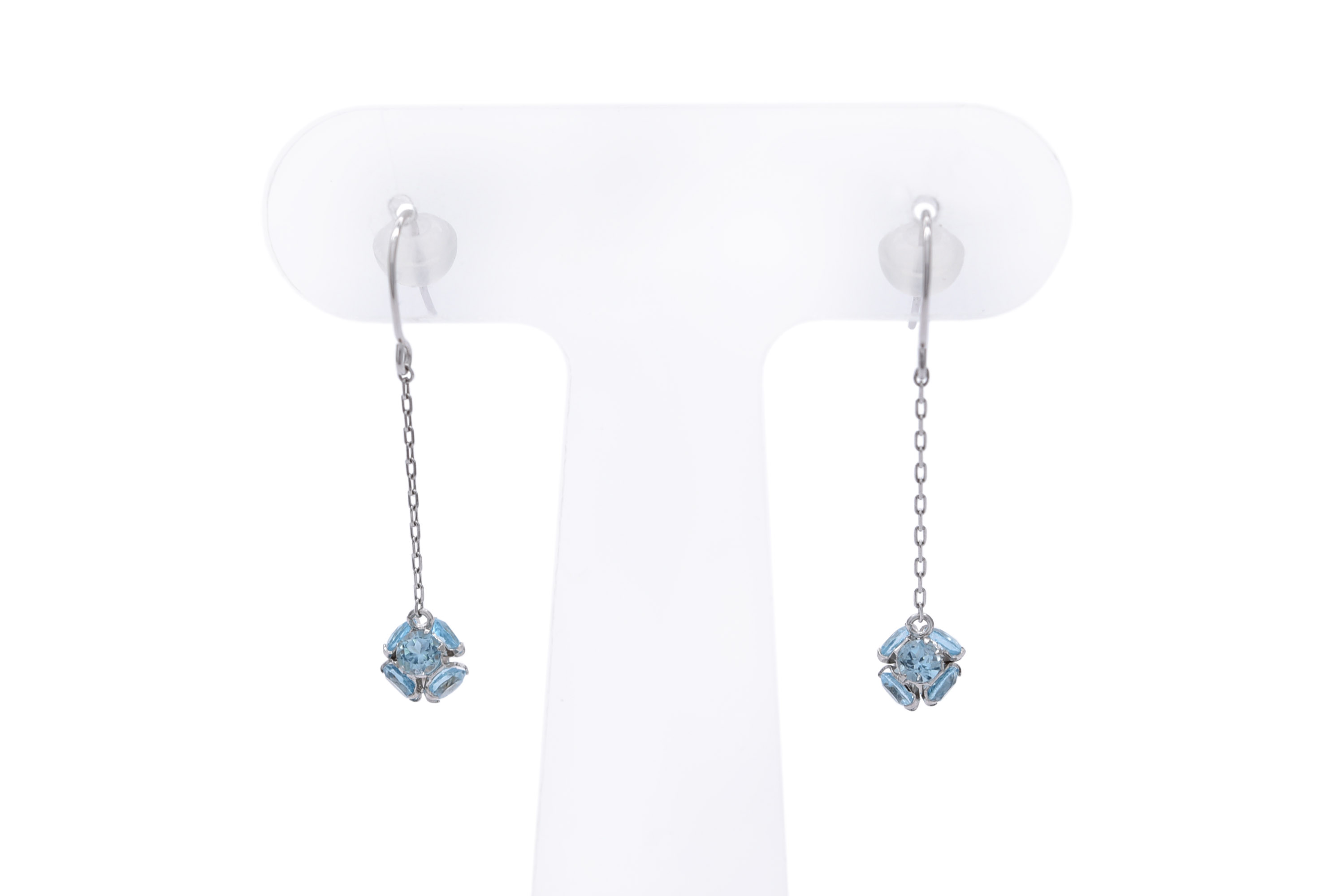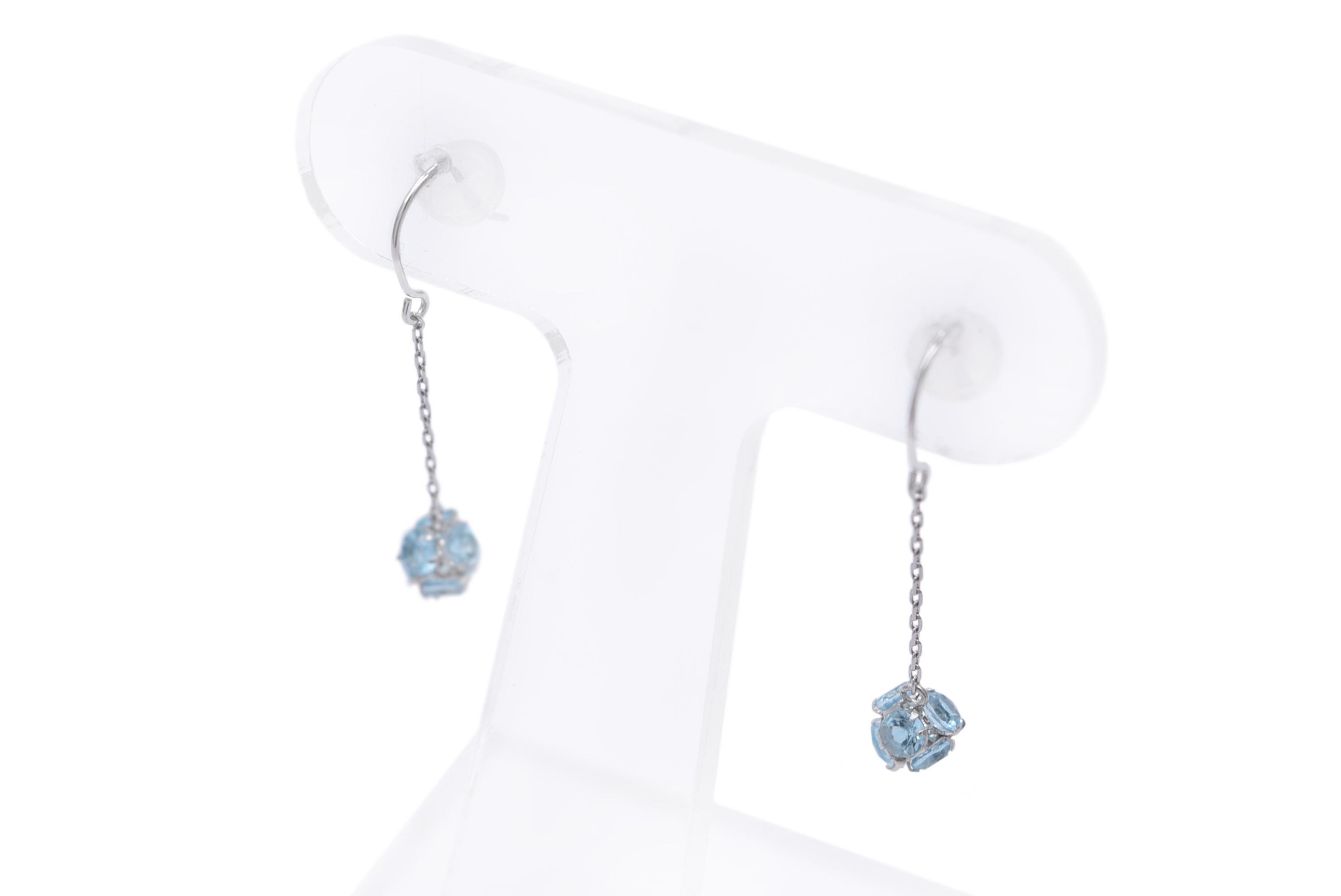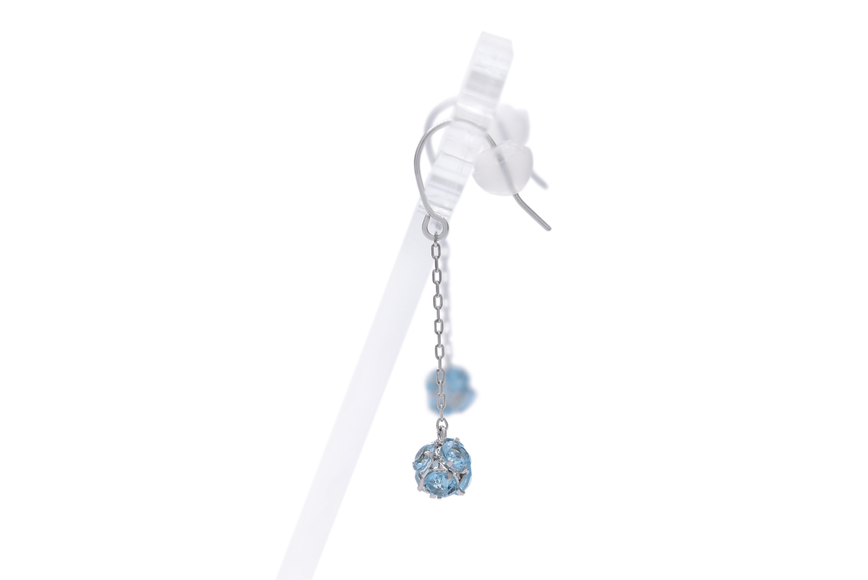 ブルートパーズを使用したピアスです。ボール型のモチーフがチェーンにぶら下がったデザインで、動く度にキラキラと輝きます。普段使いや結婚式のお呼ばれなどにもおすすめです。 #ブルートパーズ#シンプル#普段使い#結婚式