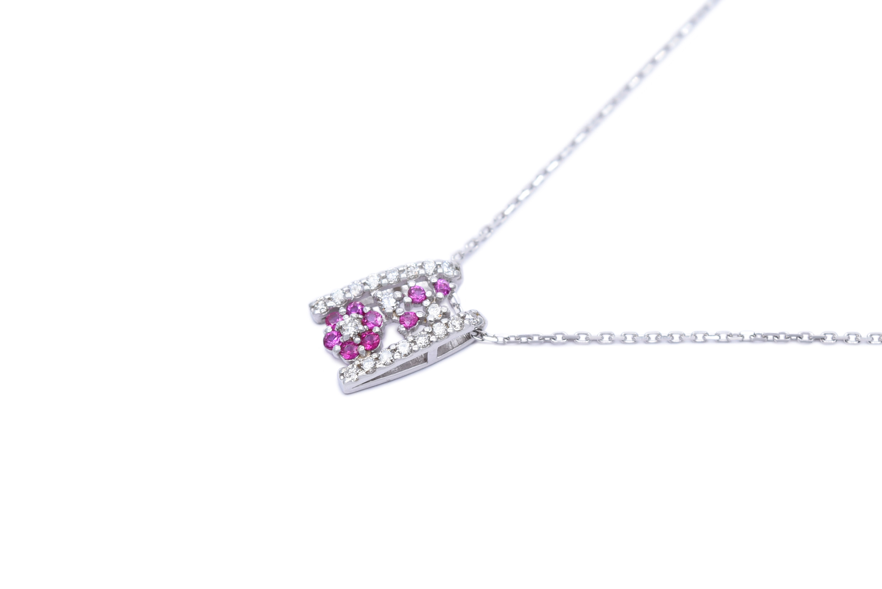 ルビーを使用したペンダントネックレスです。一番下のルビーは花の形になっていて可愛らしいデザインとなっています。普段使いやお出かけなど様々なシーンでお使いいただけます。 長さ45cm/やや長め/フリーチェーン #花#可愛い#お出かけ#普段使い#フェミニン