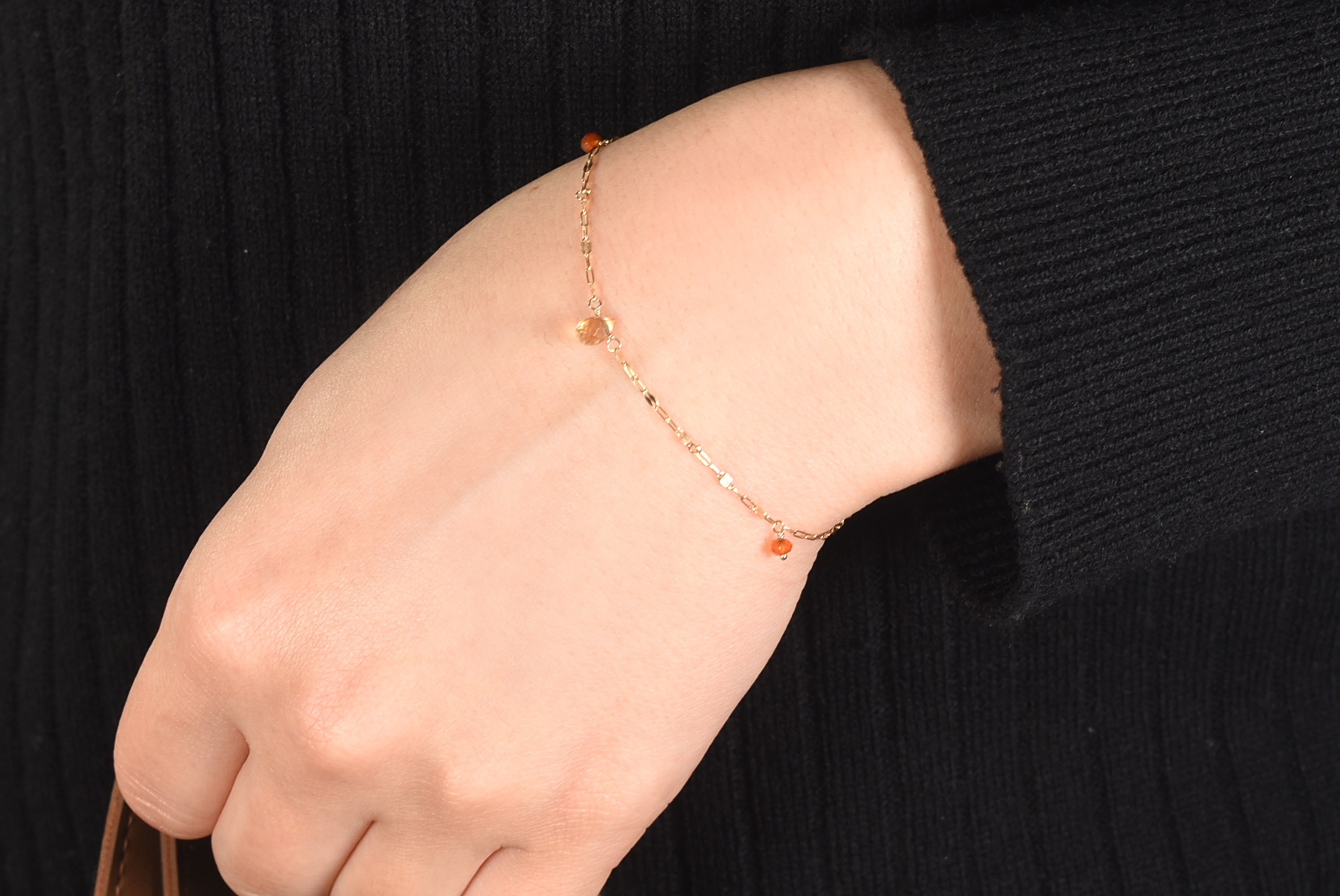 シトリンとアゲートを散りばめたブレスレットです。普段使いしやすくジュエリー初心者の方におススメの商品です。 長さ18cm/レディースタイプ /16cmにして使用可能 #シトリン#アゲート#カジュアル#普段使い#ジュエリー初心者