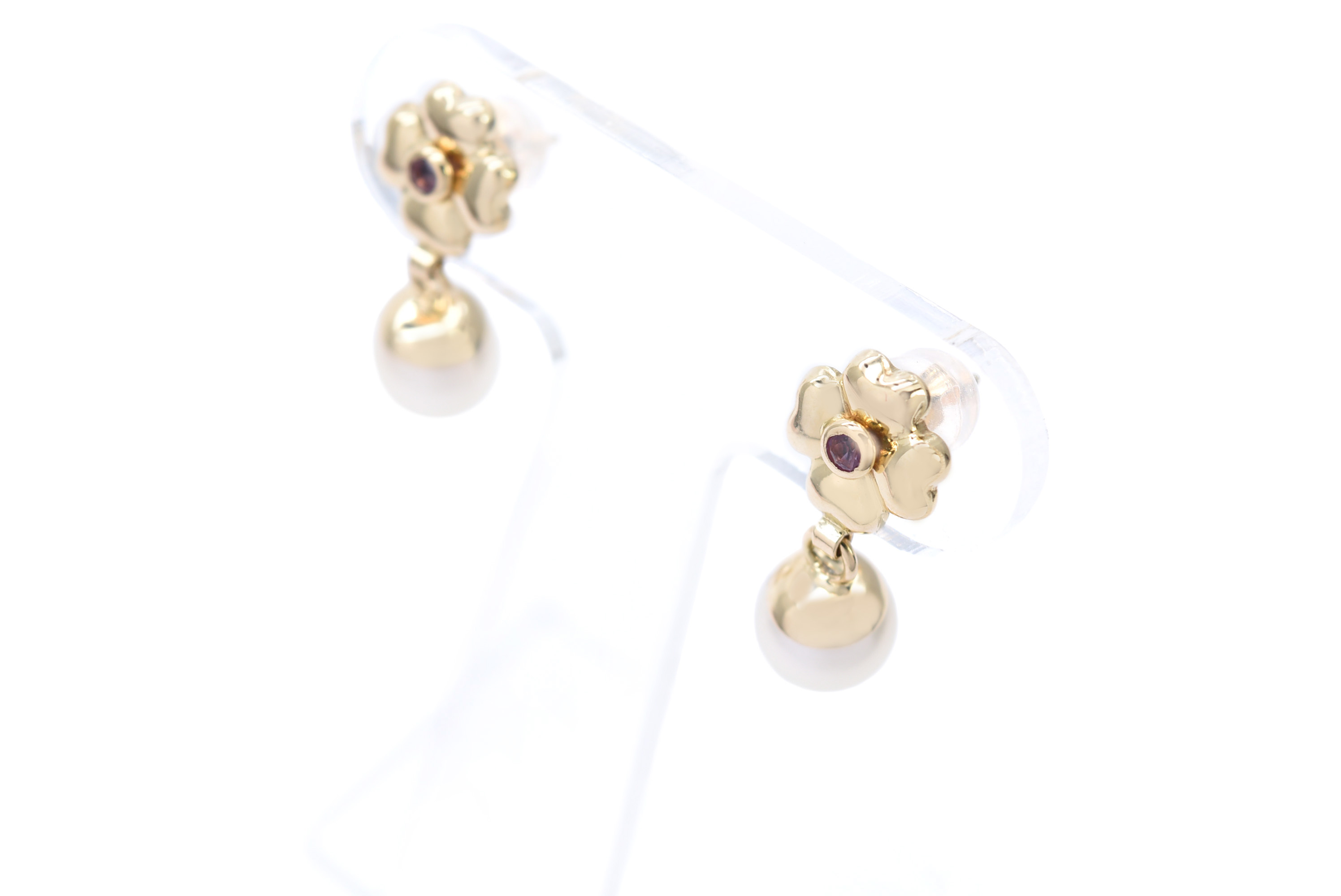 ラウンド形のアコヤパールを使用したピアスです。四つ葉のクローバーの中心にあるガーネットがラグジュアリー感をアップさせています。 #パール#アコヤ#クローバー#フェミニン#カジュアル