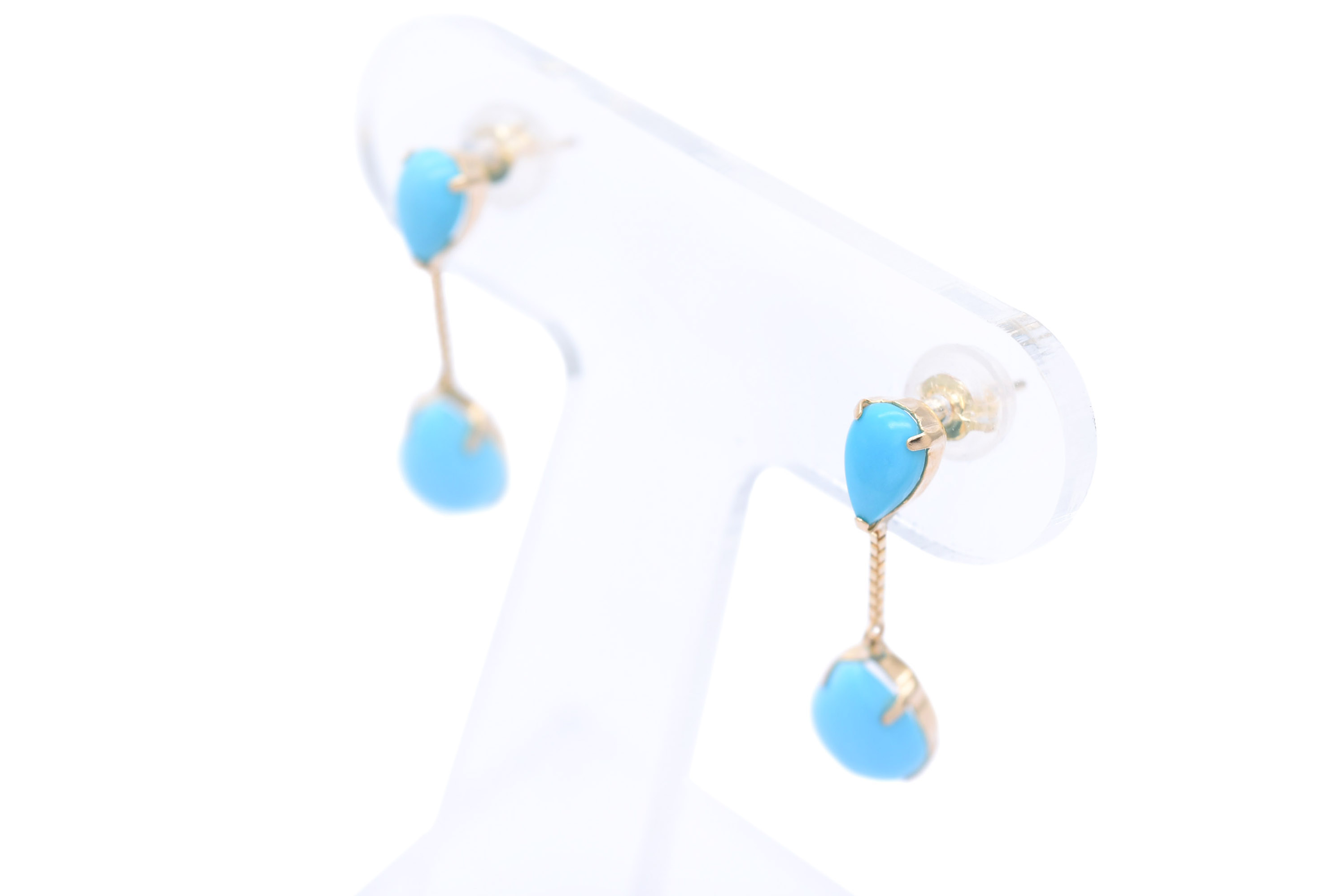 しずく形のターコイズを使用したピアスです。大きさの異なる2PCのターコイズを使用し、片方をチェーンでぶら下げ、着けたときに揺れ感が美しくみえるようセッティングされたアイテムです。 #ターコイズ#カジュアル#クール#揺れる#普段使い#お出かけ