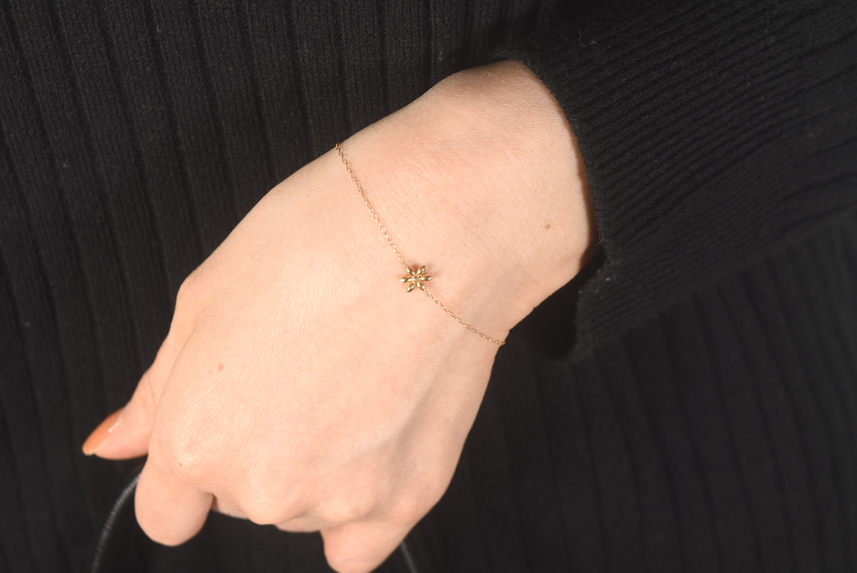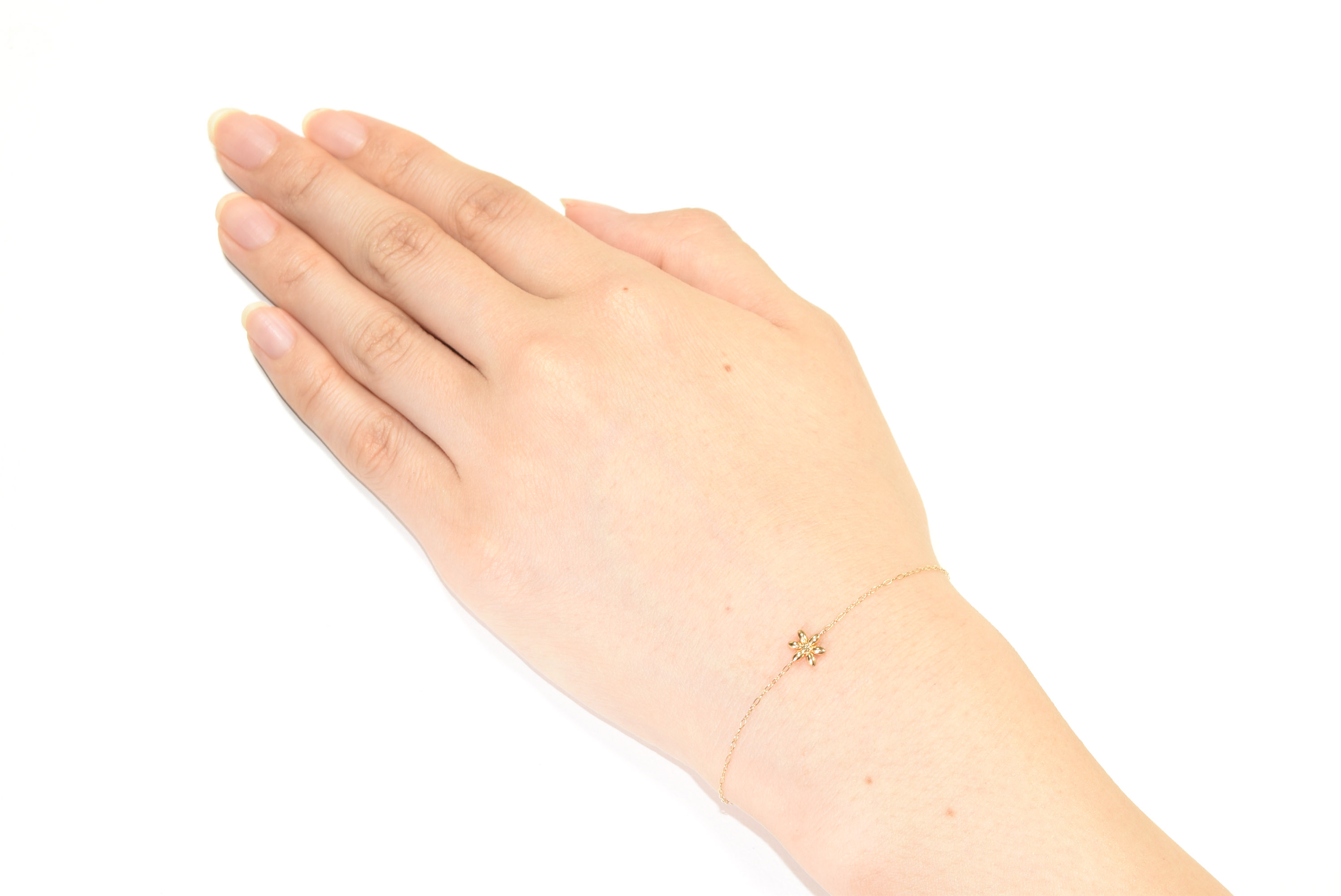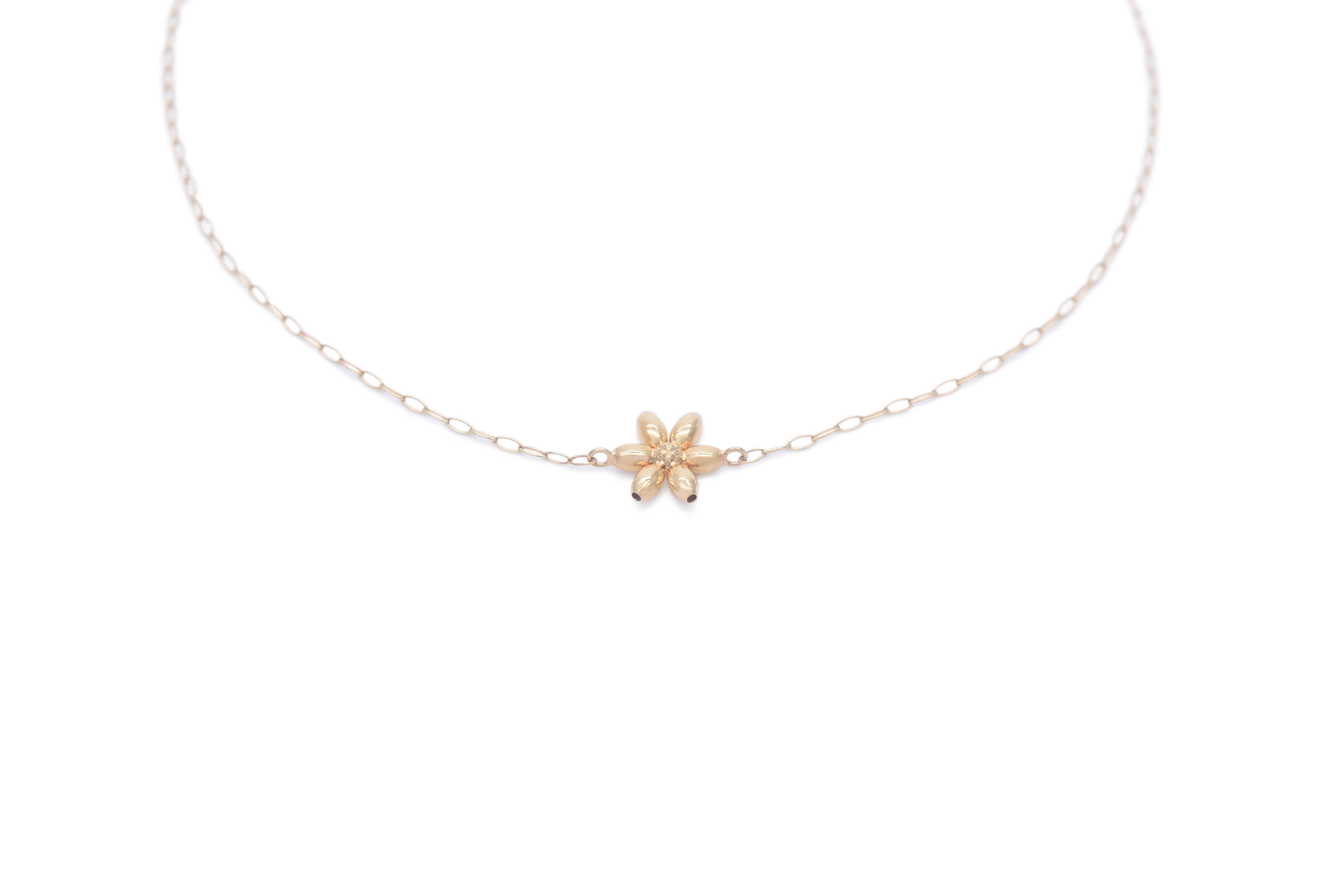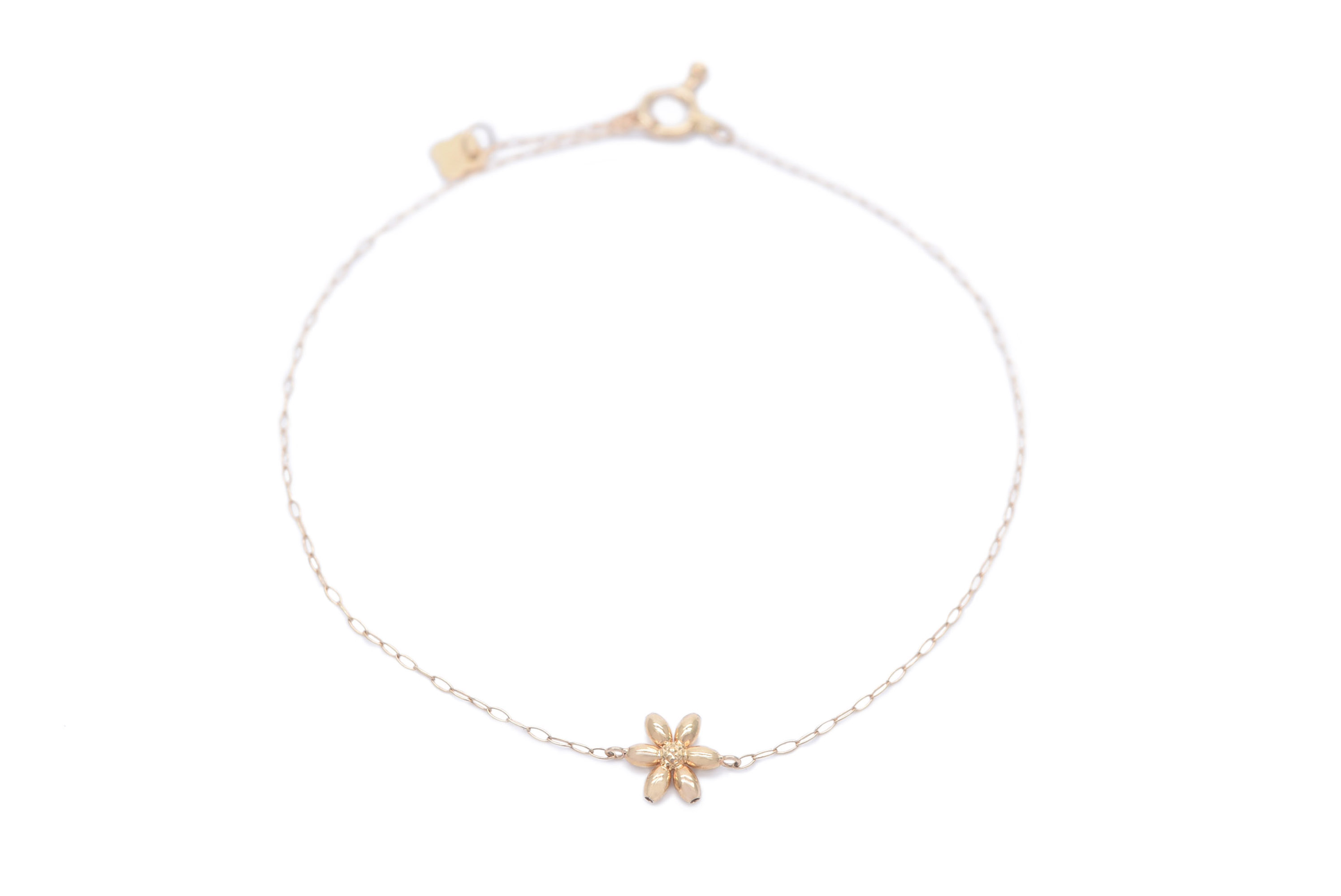 イエローゴールドを使用したブレスレットです。シンプルながらもフラワーモチーフのワンポイントが可愛らしいデザインです。カジュアルから綺麗目まで幅広く使うことのできるアイテムです。 長さ18cm/レディースタイプ/16cmに調節可能 #花#シンプル#カジュアル#普段使い#お出かけ