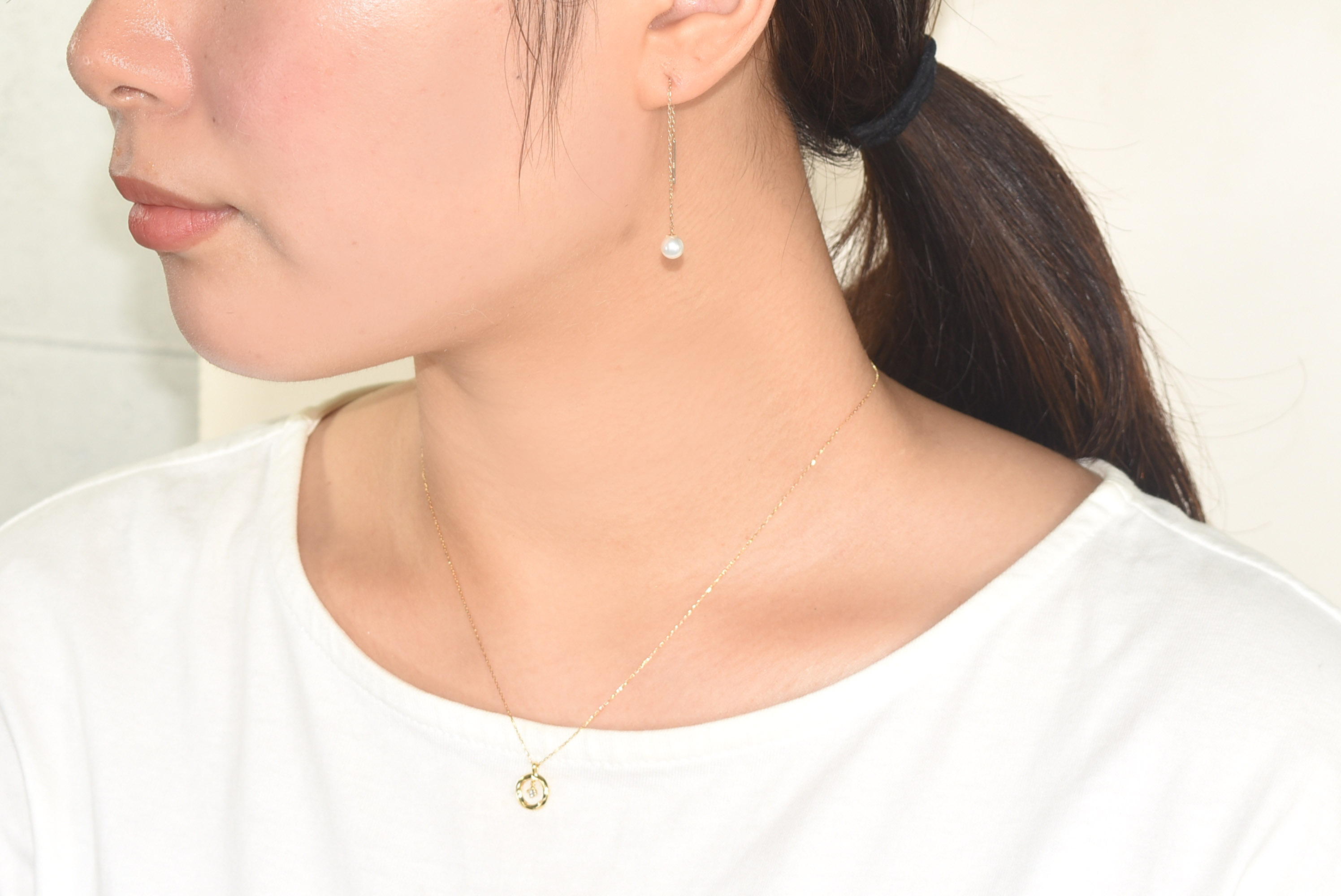 ダイヤモンドを使用したペンダントネックレスとラウンド形のパールを使用したピアスのセットです。丸みのあるネックレスと揺れるロングピアスの組み合わせが可愛く女性らしいアイテムです。お出かけや結婚式のお呼ばれなどにおすすめです。 長さ40cm/やや短め/37cmに調節可能 #ダイヤモンド#パール#セットジュエリー#可愛い#普段使い#お出かけ#結婚式