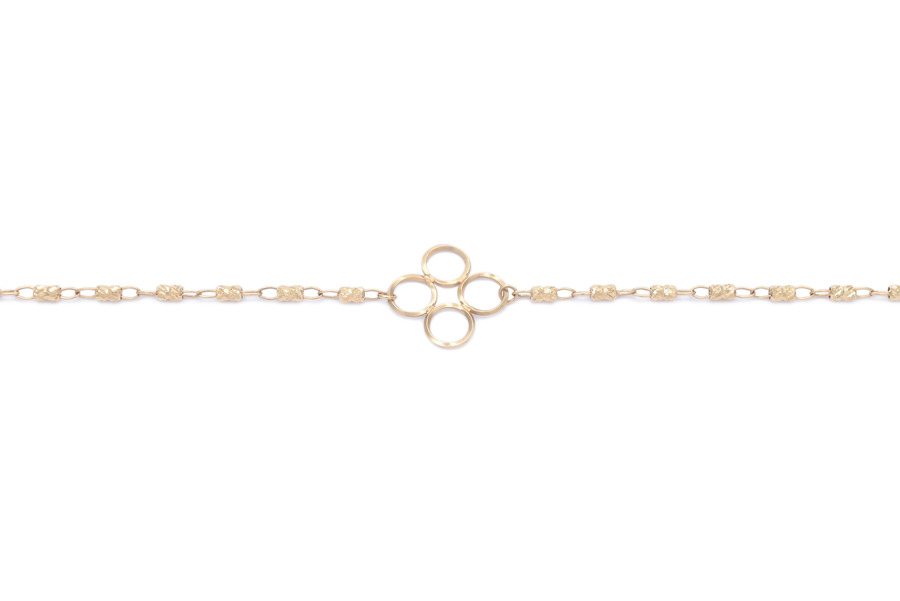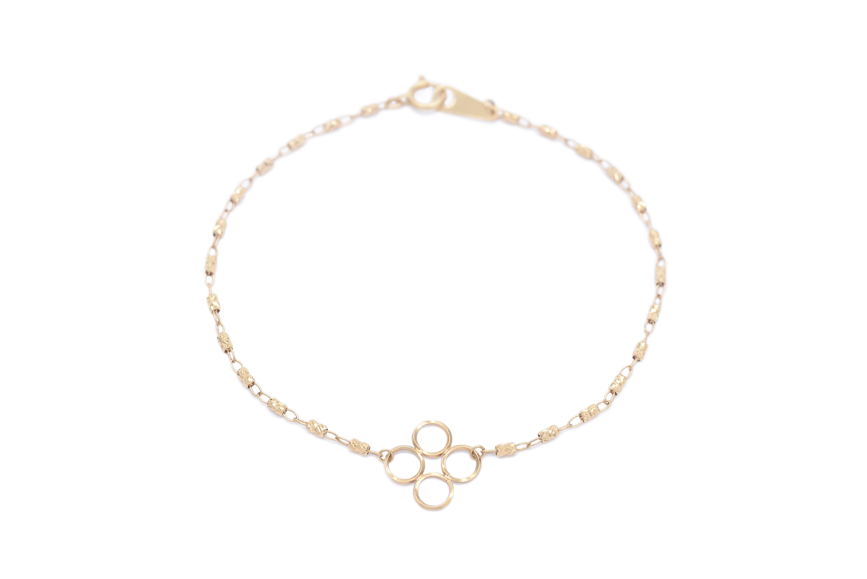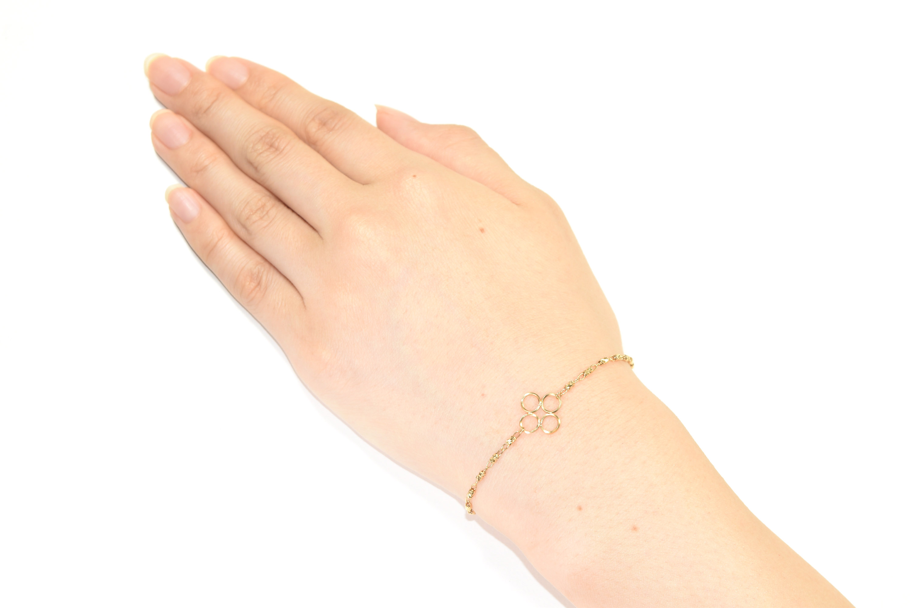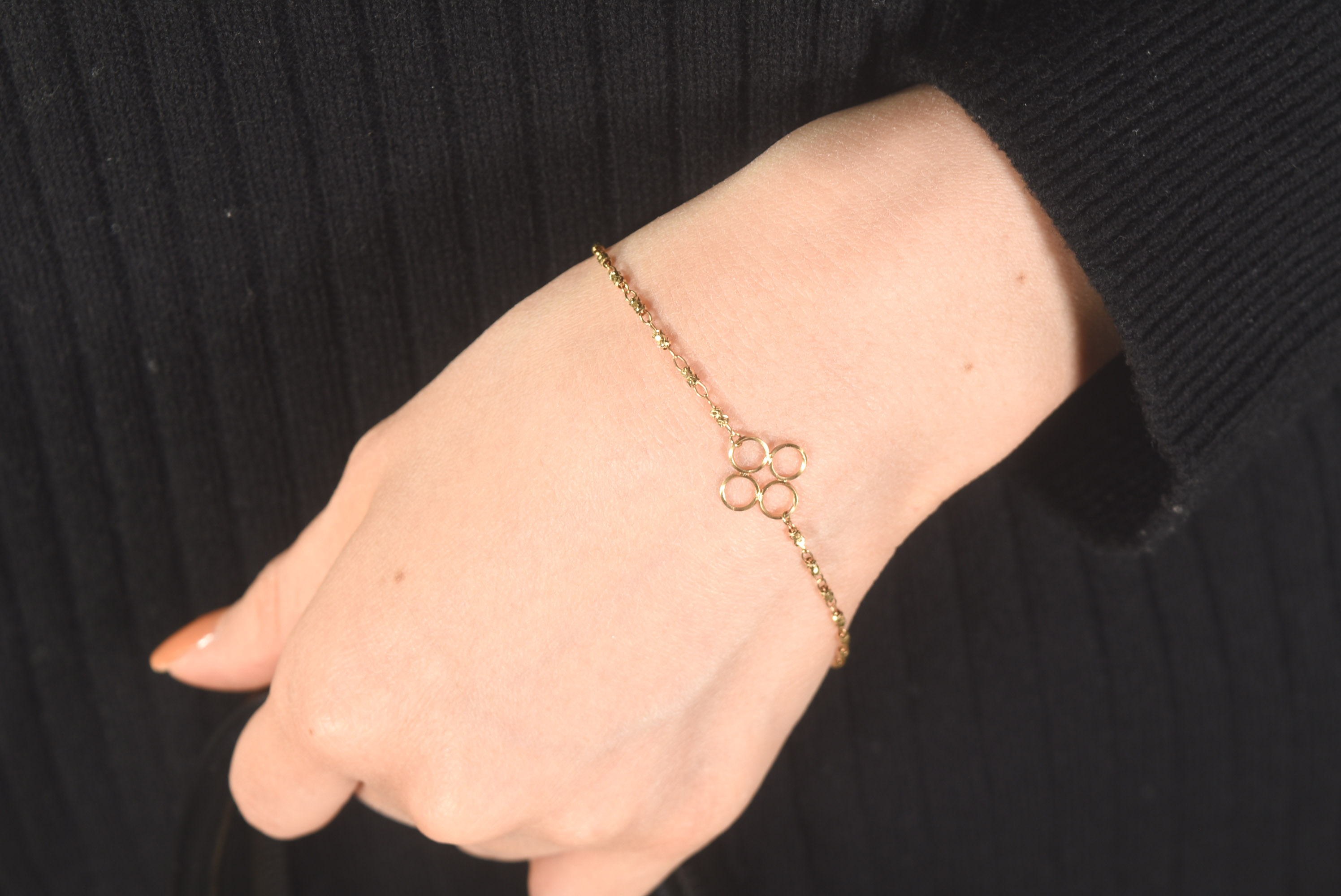 イエローゴールドを使用したブレスレットです。サークルデザインがお花のように見える可愛らしさのあるアイテムです。シンプルなので普段使いからお出かけまで様々なシーンにおすすめです。 長さ18cm/ レディースタイプ/長さ固定 #カジュアル#花#シンプル#普段使い#お出かけ