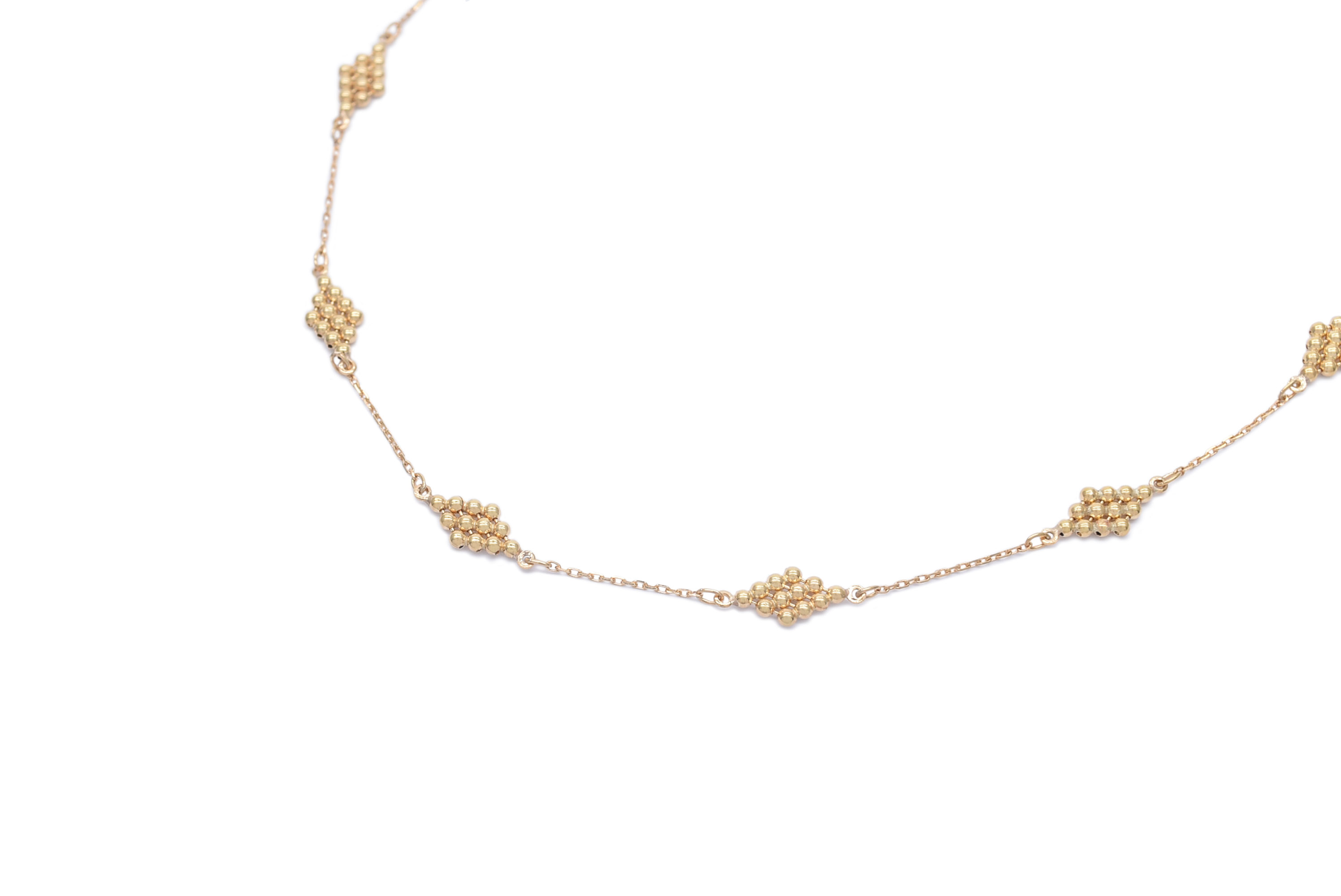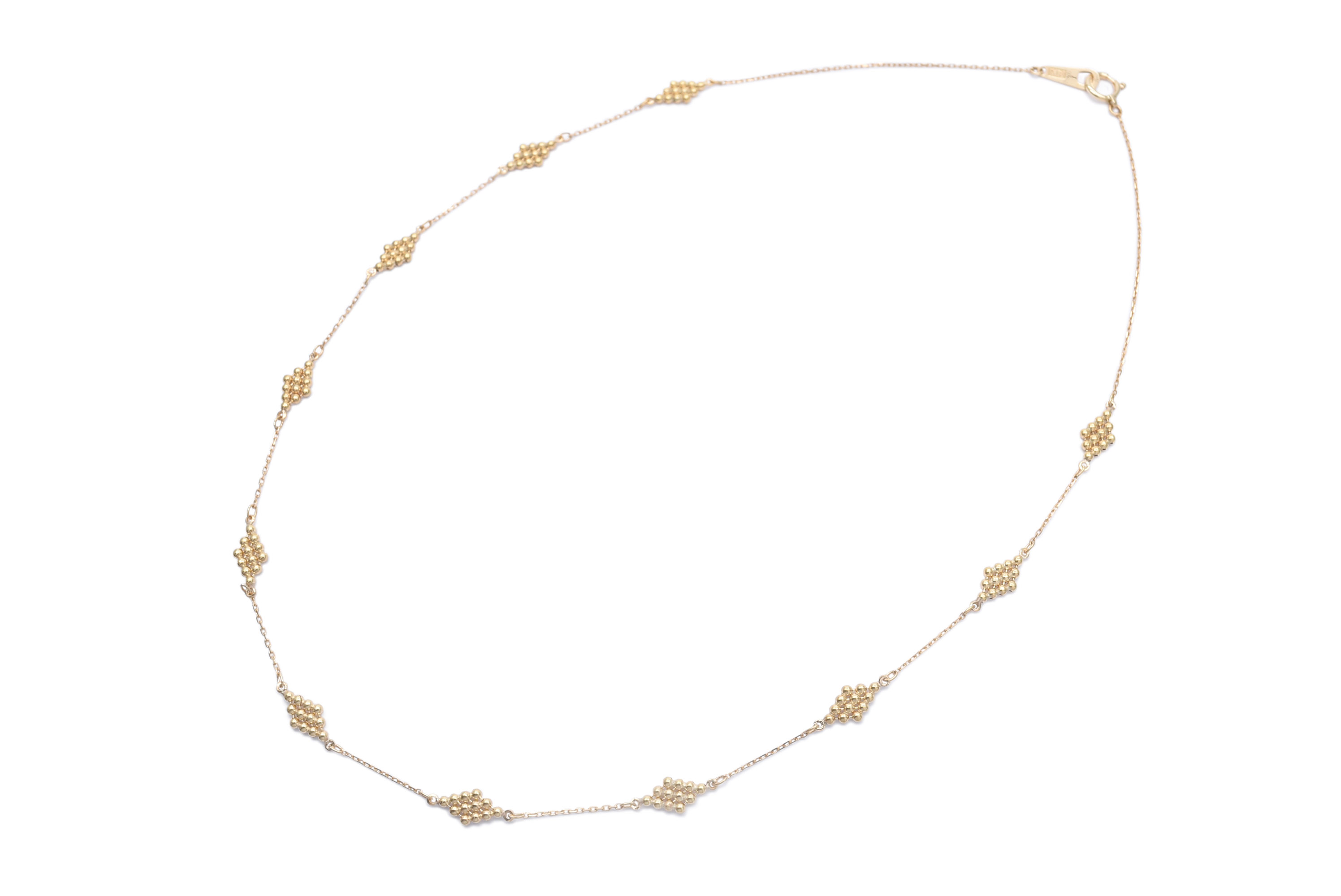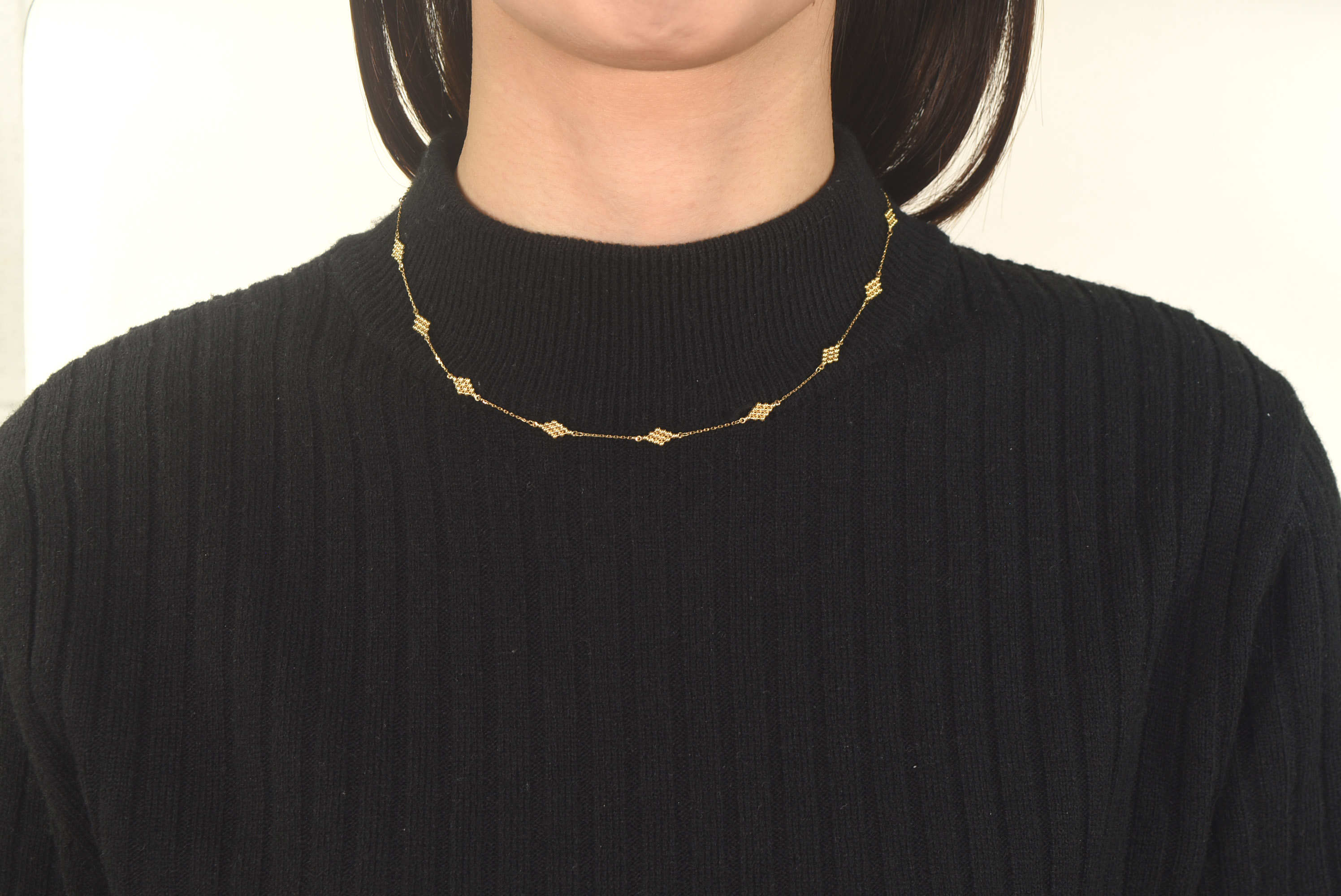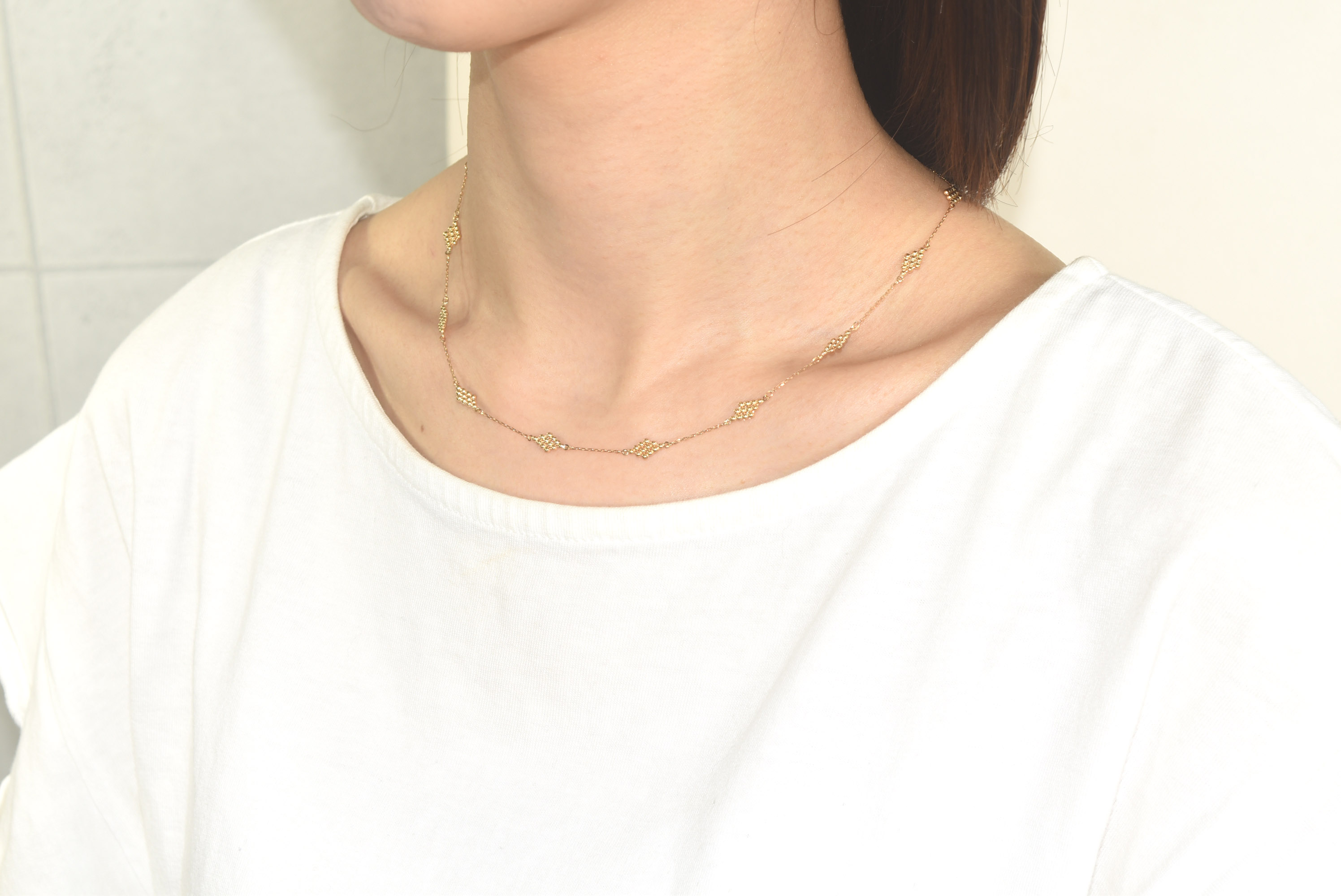 イエローゴールドを使用したネックレスです。シンプルながらもひし形モチーフがアクセントになっているおしゃれなデザインです。普段使いやお出かけなどにおすすめです。 長さ40cm/やや短め/長さ固定 #カジュアル#シンプル#ひし形#普段使い#お出かけ