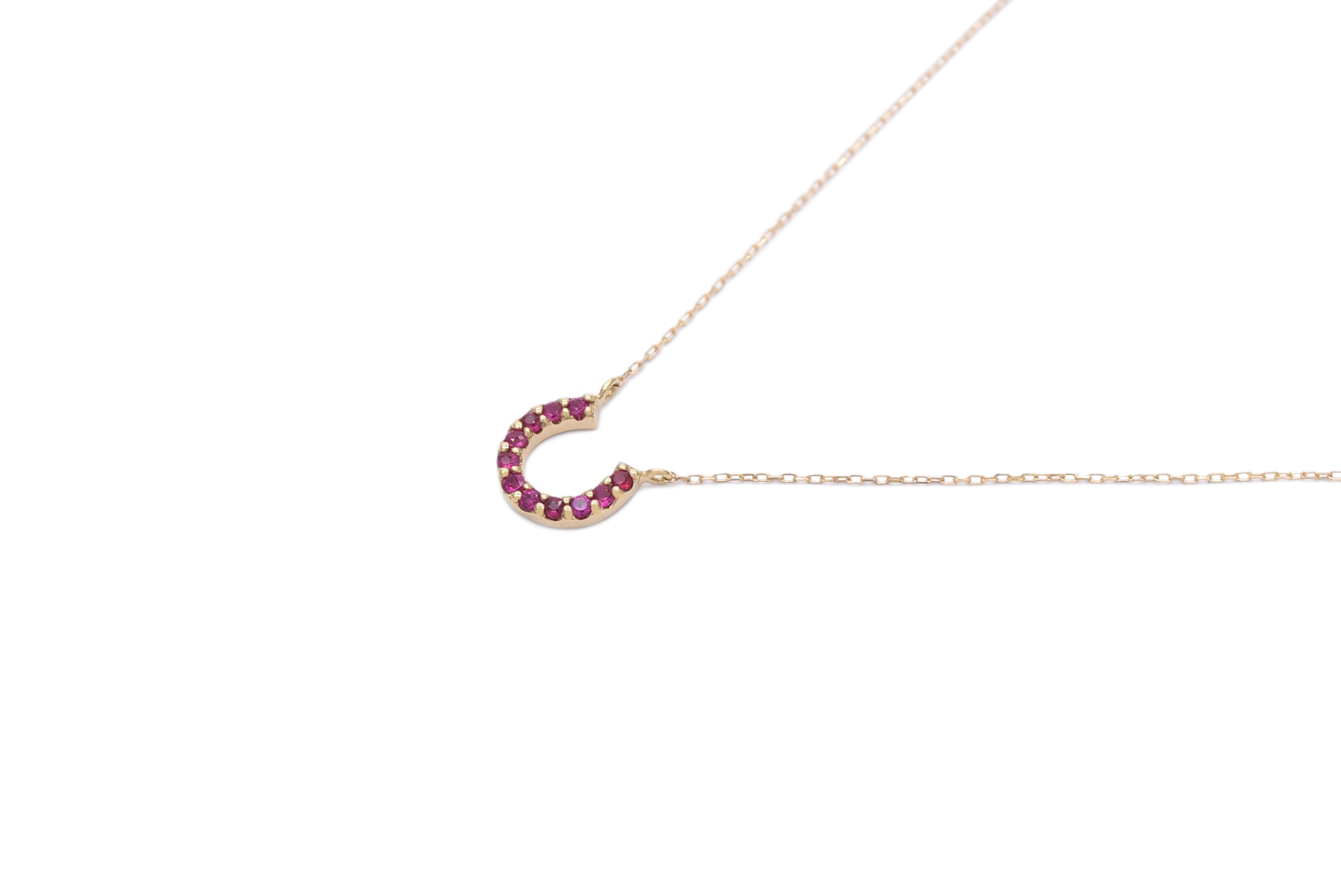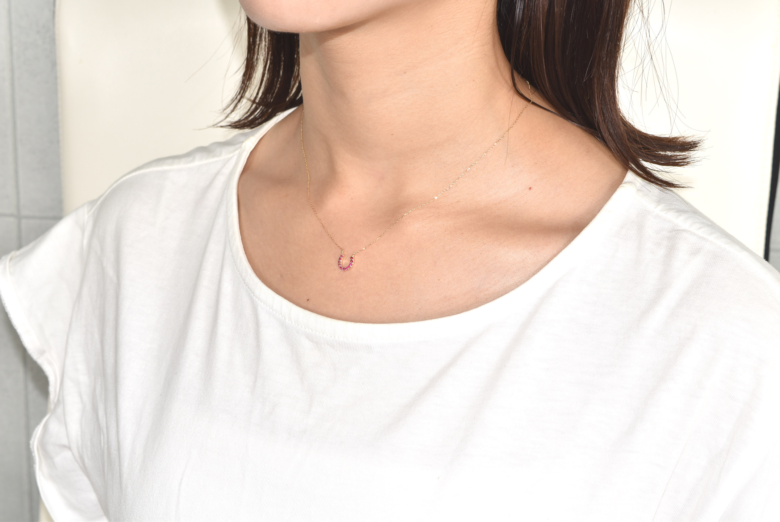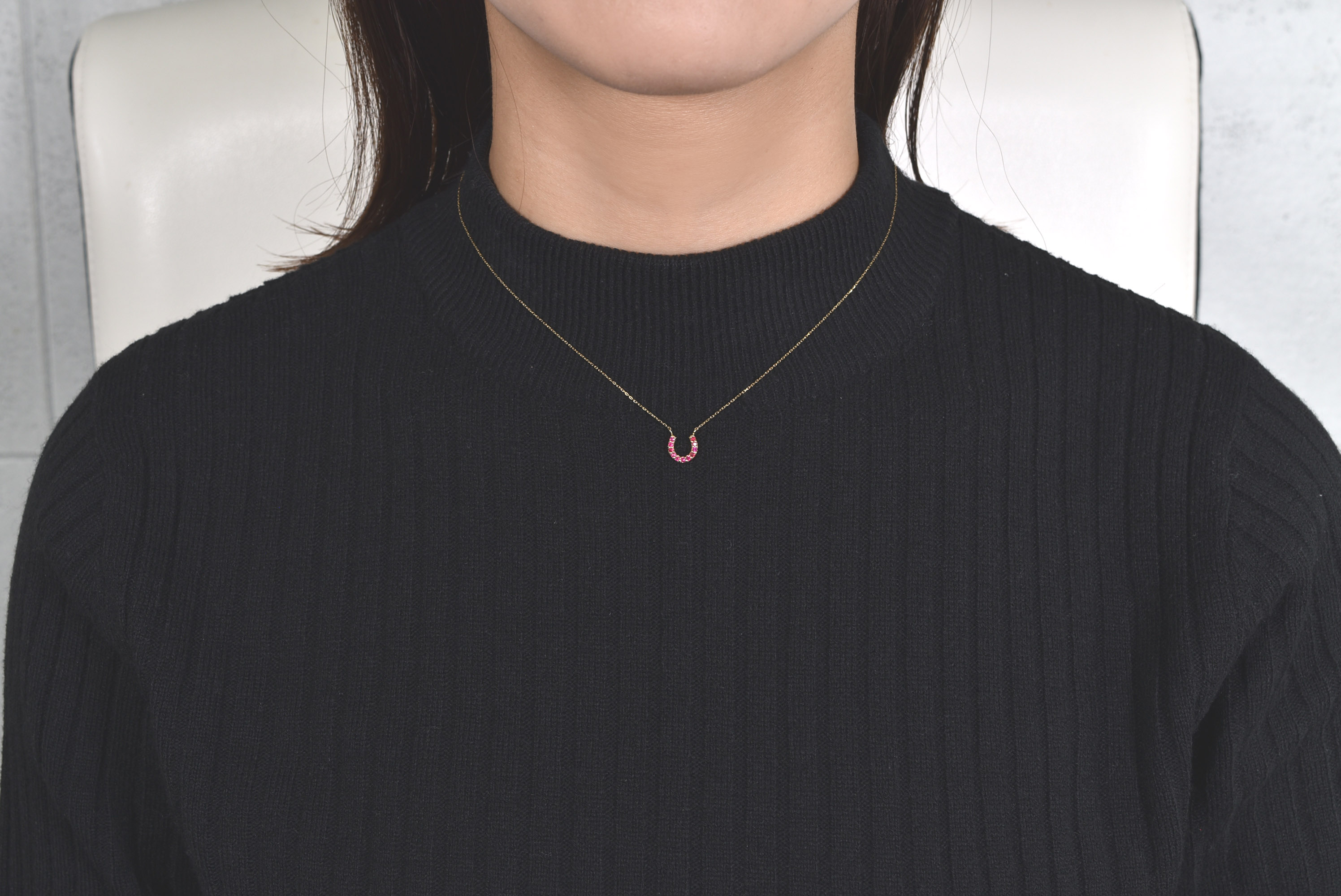 ルビーを使用したペンダントネックレスです。馬蹄モチーフが胸元に幸運を呼び込むデザイン。モチーフは大きすぎず、小さすぎず、上品に華やかさを添えます。 長さ40cm/やや短め/37cmに調節可能 #ルビー#馬蹄#シンプル#普段使い#お出かけ