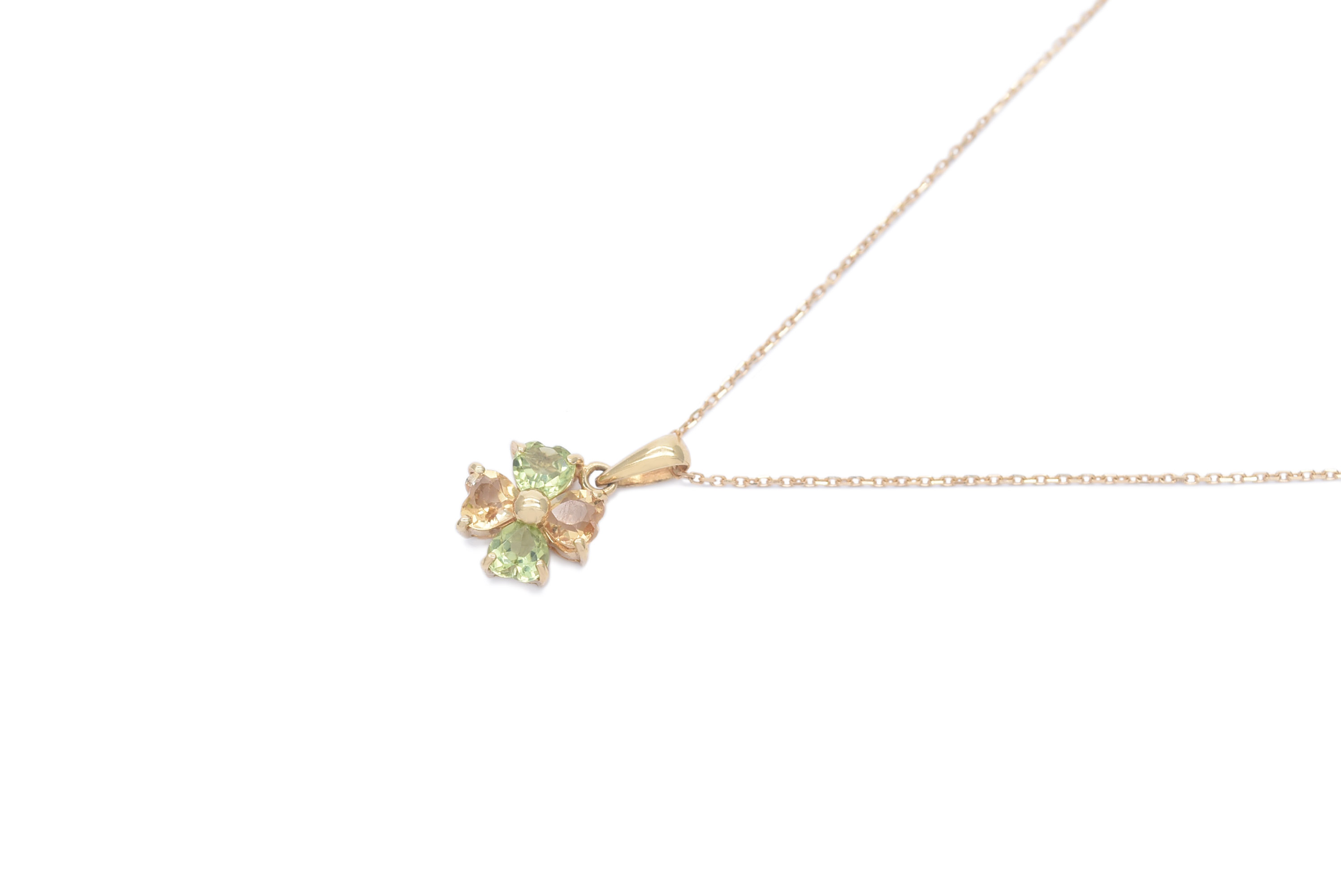 四つ葉のクローバーをシトリンとペリドットで形を作っている可愛らしいデザインで、色石にあまり慣れていない方でも使いやすいアイテムとなっています。 長さ42cm/普通/フリーチェーン #クローバー#ペリドット#シトリン#誕生石#花