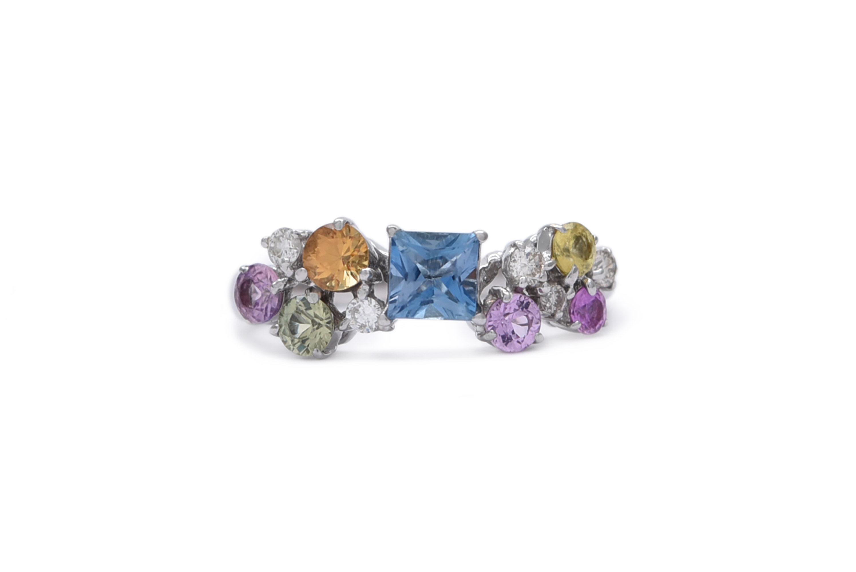 様々なカラーのサファイア・ブルートパーズ・ダイヤモンドを使用したリングです。カラフルなデザインの上品さと可愛らしさのあるアイテムです。お出かけや女子会などにおすすめです。 #マルチ#カラフル#可愛い#お出かけ#女子会